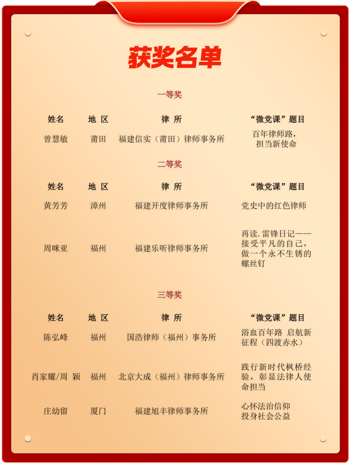 福州市律師協(xié)會:喜報!我市3部“微黨課”作品獲獎 福州律師資訊發(fā)布者 福州律師網2024年12月2日2024年9月,福建省律師協(xié)會黨建工作委員會在全省律師行業(yè)基層黨組織中開展“微黨課”(線上)競賽活動。參賽選手們結合自身詳情