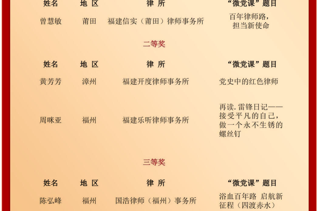 福州市律師協(xié)會(huì):喜報(bào)!我市3部“微黨課”作品獲獎(jiǎng) 福州律師資訊發(fā)布者 福州律師網(wǎng)2024年12月2日2024年9月,福建省律師協(xié)會(huì)黨建工作委員會(huì)在全省律師行業(yè)基層黨組織中開(kāi)展“微黨課”(線上)競(jìng)賽活動(dòng)。參賽選手們結(jié)合自身詳情