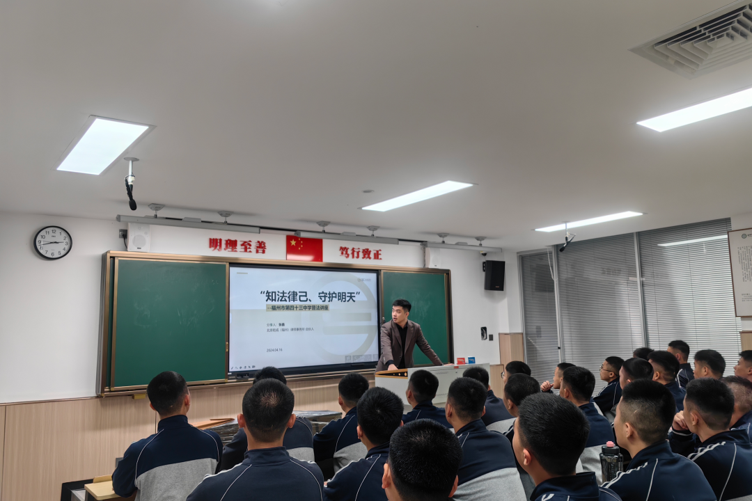 北京乾成福州律師事務(wù)所為福州市第四十三中學(xué)學(xué)生開(kāi)展“知法律己、守護(hù)明天”主題普法活動(dòng) 福州律師資訊發(fā)布者 福州律師網(wǎng)2024年4月22日4月16日下午,北京乾成福州律師事務(wù)所張?chǎng)温蓭煈?yīng)福州市公安局、福州市司法局邀請(qǐng),走進(jìn)福州第四十三中學(xué)開(kāi)展“知法律己、守護(hù)詳情
