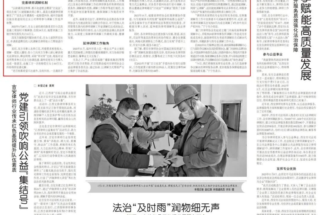 新春“開門紅”!《法治日報》突出報道福建省律師調(diào)解工作 福州律師資訊發(fā)布者 福州律師網(wǎng)2024年3月4日2月29日,中央政法委機關(guān)報《法治日報》“中國律師”版頭條刊發(fā)通訊稿件《探索“律師+”模式 擴大聯(lián)調(diào)“朋友圈”——福建蹄詳情