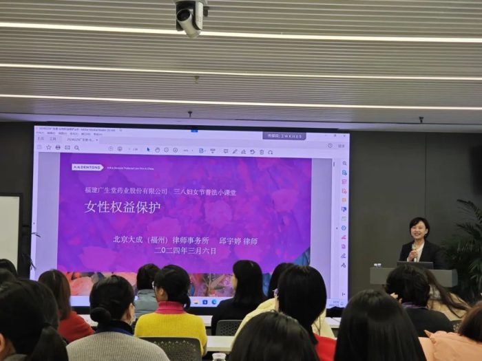 大成福州律師邱宇婷受邀開展“女性權(quán)益保護”三八婦女節(jié)普法小課堂 福州律師資訊發(fā)布者 福州律師網(wǎng)2024年3月8日2024年3月6日,為慶祝即將到來的第114個“三八”國際勞動婦女節(jié),進一步增強女員工的法治觀念和維權(quán)意識,福建廣生堂藥詳情