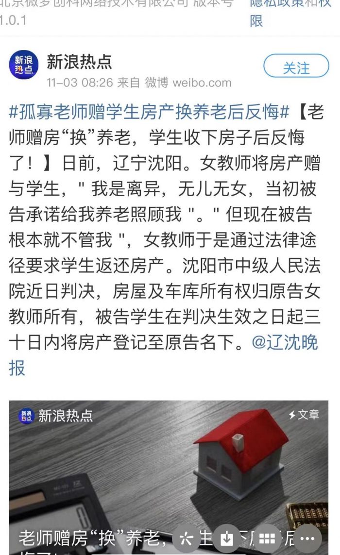福州律師原創(chuàng)熱評(píng):沈陽(yáng)孤寡老師贈(zèng)房學(xué)生換養(yǎng)老,現(xiàn)在反悔了,怎么看? 房屋物業(yè)發(fā)布者 福州律師網(wǎng)2022年11月4日 福州律師、福州房產(chǎn)律師、福州繼承律師熱點(diǎn)法律評(píng)析 ? 這二天沈陽(yáng)孤寡老人將房產(chǎn)送給學(xué)生換養(yǎng)老,后面反悔獲法詳情